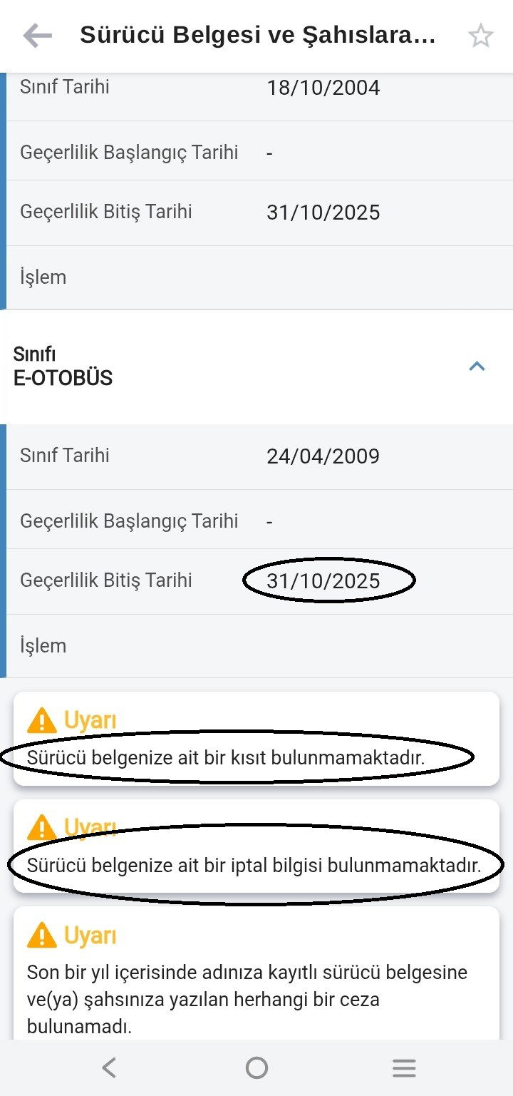 Yukarıdaki e-devlet üzerinden alınan bilgi kişinin sürücü belgesi süresi 31/10/2025 de bitmiş.